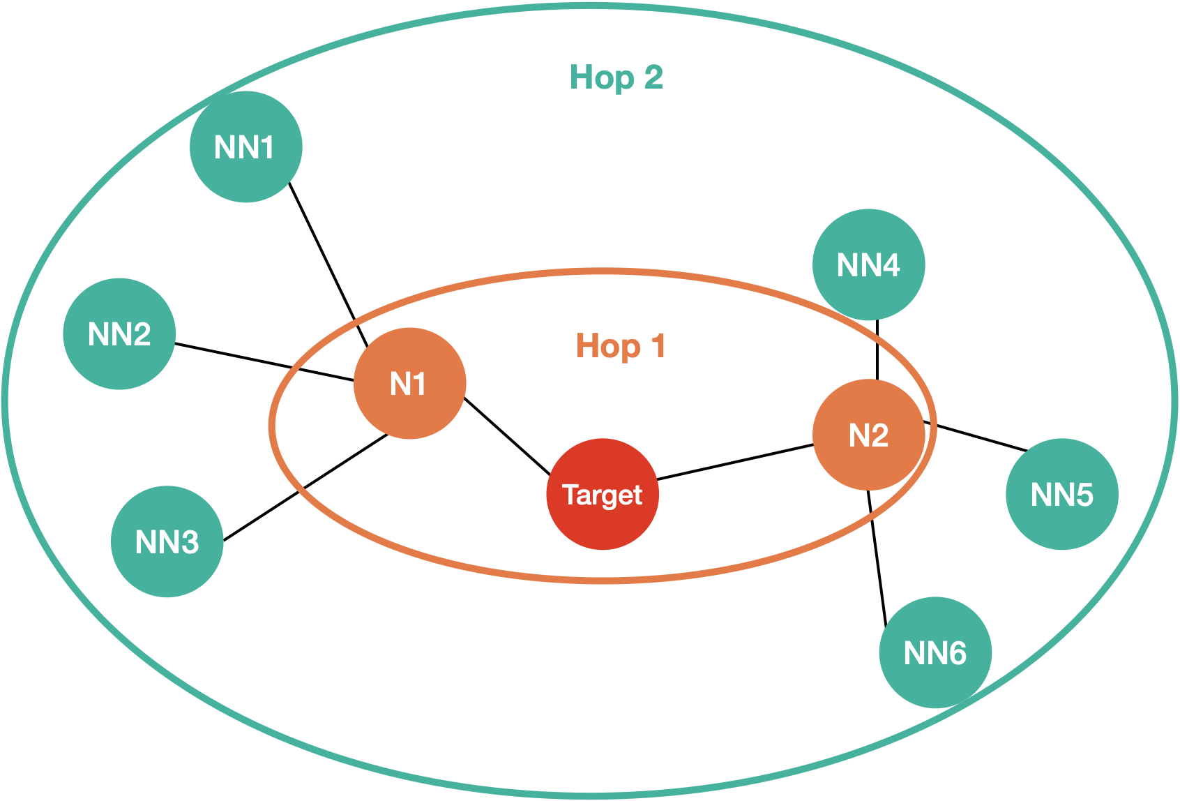 보통 딥러닝 프레임워크에서는 전체 데이터세트에 대해 mini-batch 단위로 학습을 수행합니다. 그러나 그래프에서는 아무 노드를 batch로 불러오게 되면, 중요한 connection을 잃게 되는 문제가 발생할 것입니다. 이때 GNN의 기본 개념을 다시 생각해볼 수 있습니다. GNN은 기본적으로 이웃의 정보를 바탕으로 노드 임베딩을 학습합니다. 이때 직접적으로(direct) 이웃한 노드들을 1 hop에 있다고 합니다. 이 1 hop 이웃 노드들의 이웃을 2 hop이라고 표현합니다. 생각해 보면 이는 GNN layer를 두 개 쌓은 것과 마찬가지입니다.