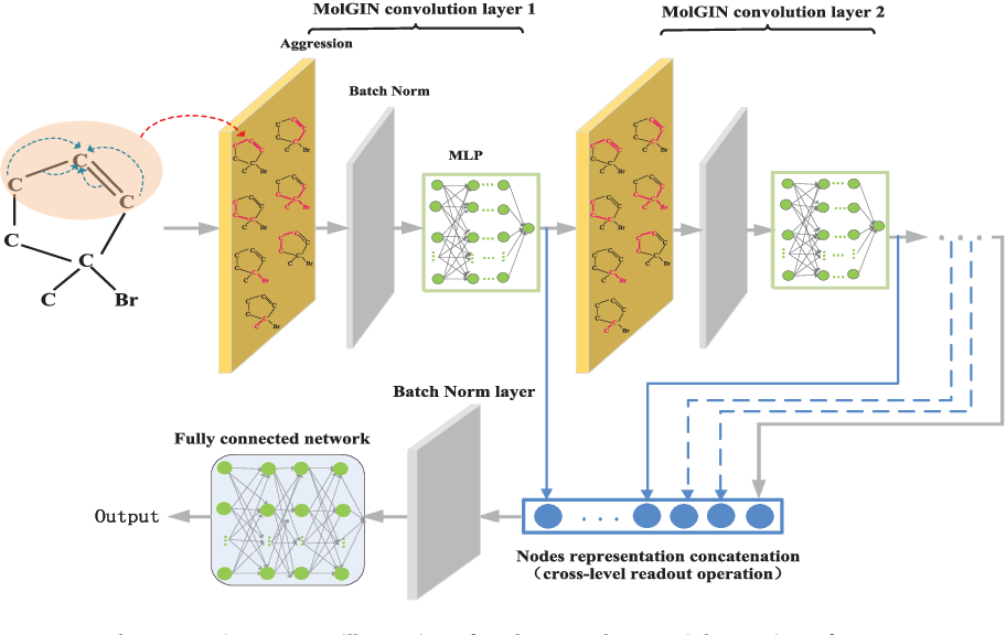 $$\acute{h_i} = MLP((1+\epsilon) \bullet h_i + \sum_{j\in{N_i}}h_j)$$