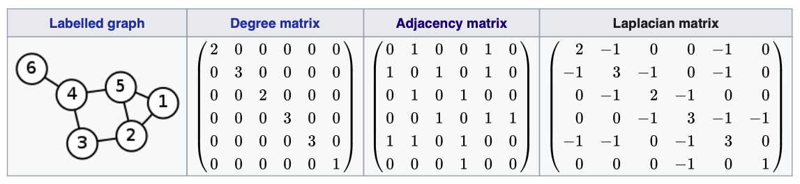 \(D\)는 그래프에서 각 노드가 연결된 이웃의 수를 표현하는 차수 행렬(degree matrix)입니다. Degree matrix는 대각 원소 외에는 모두 0으로 이루어져 있으며, 각 대각 원소는 노드가 가진 이웃 수를 표현하는 대각 행렬입니다. \(A\)는 위에서 표현한 인접 행렬입니다. 이 두 행렬을 통해서 라플라시안 행렬을 구할 수 있습니다. 이는 인접 행렬이 표현하는 그래프의 연결 상태뿐만 아니라, 차수 행렬이 표현하는 그래프의 특성을 반영합니다.