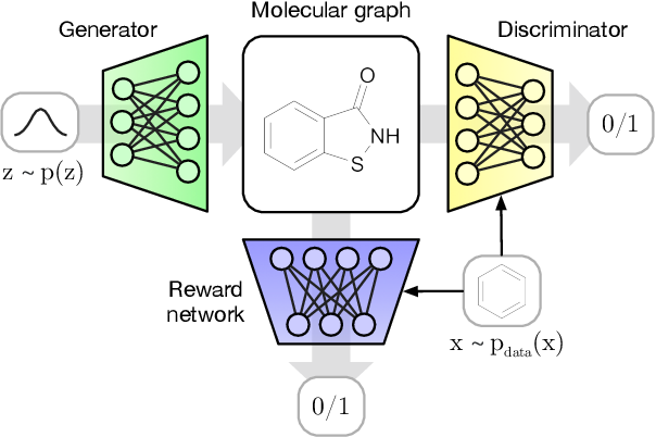 2018년에 제안된 molecular GAN(MolGAN)은 분자 구조 생성에 유명한 GAN 기반 모델입니다. 이 모델은 WGAN과 그라디언트 패널티를 결합하여 그래프 구조화된 데이터를 직접 처리하며, 원하는 화학적 속성을 가진 분자를 생성하기 위한 강화 학습 목적을 갖습니다.. MolGAN의 아키텍처는 다음 그림과 같습니다.