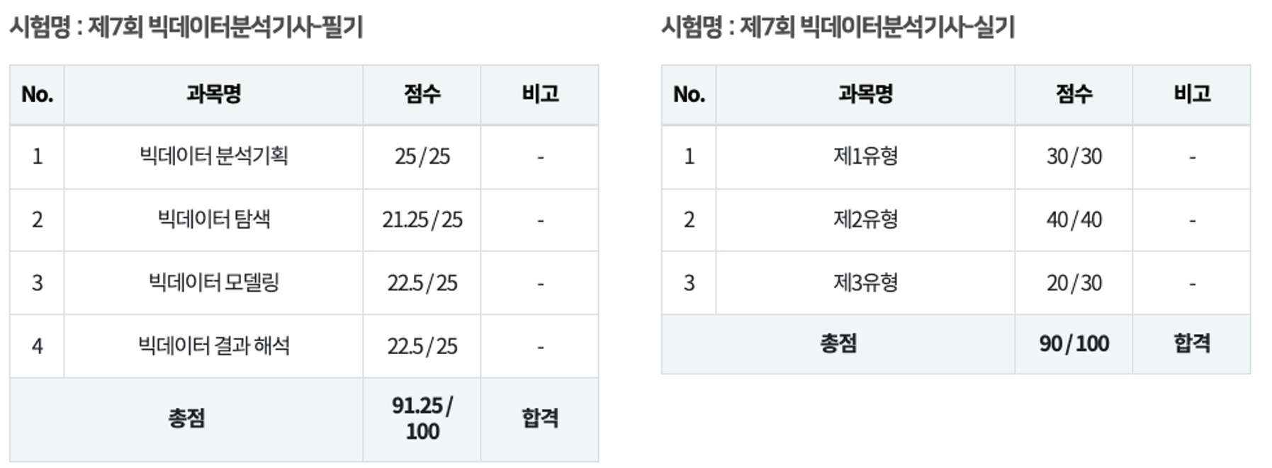 2023년 12월 15일 자로 제7회 빅데이터분석기사 필기와 실기 점수가 모두 공개되었습니다.