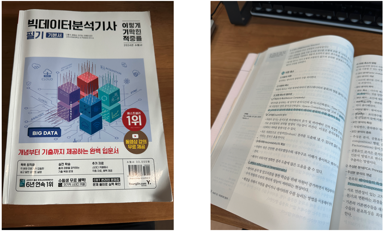 저는 이기적의 빅데이터분석기사 필기 기본서를 구입해서 공부했습니다. 딱히 책이 좋고 나쁘고는 잘 모르겠고, 제가 시험 준비할 당시 가장 최신 시험 정보까지 반영해서 구입했습니다. 필기는 주말 제외 3주 동안 하루에 1~2시간씩 공부했습니다. 시험 전 주말에만 이틀 모두 4시간 정도 집중적으로 공부했고, 마지막 3주 차는 정리하는 위주로 1시간 미만으로 공부했던 것 같습니다 (거의 공부 안 했습니다).