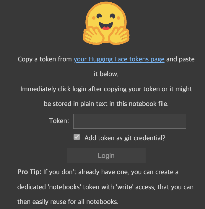 이때, 각자의 허깅페이스 계정의 토큰을 입력해야 합니다.